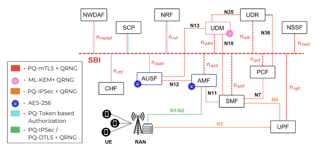 - gNB-Core interfaces (NGAP & N3) using PQ-IKEv2 for future-proof tunnel protection